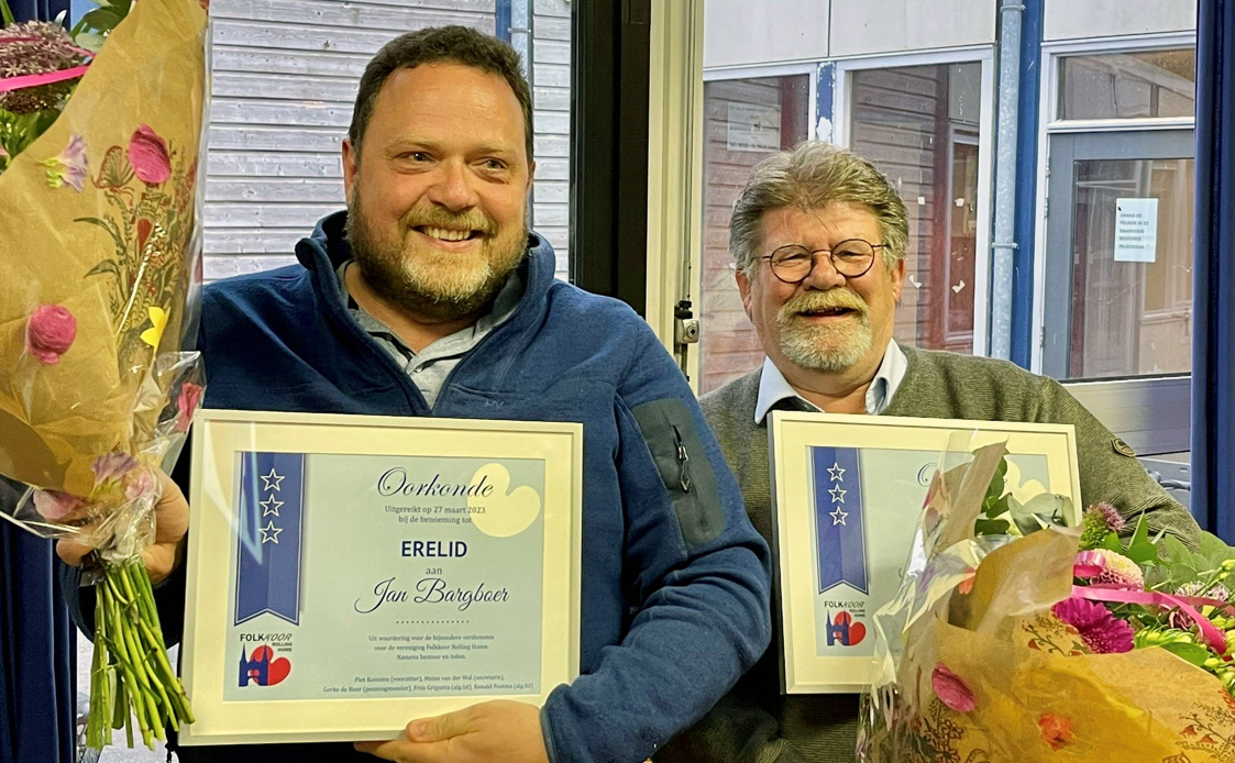 Afgelopen maandagavond, voor het begin van de reguliere oefenavond, werden de oud Voorzitter en de oud Penningmeester Henk Huijsman en Jan Bargboer door de Voorzitter van Rolling Home, Piet Kooistra, benoemd tot Erelid van het Koor.